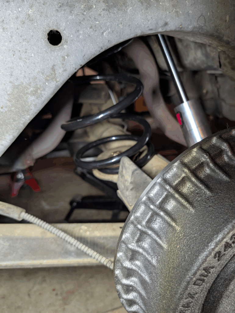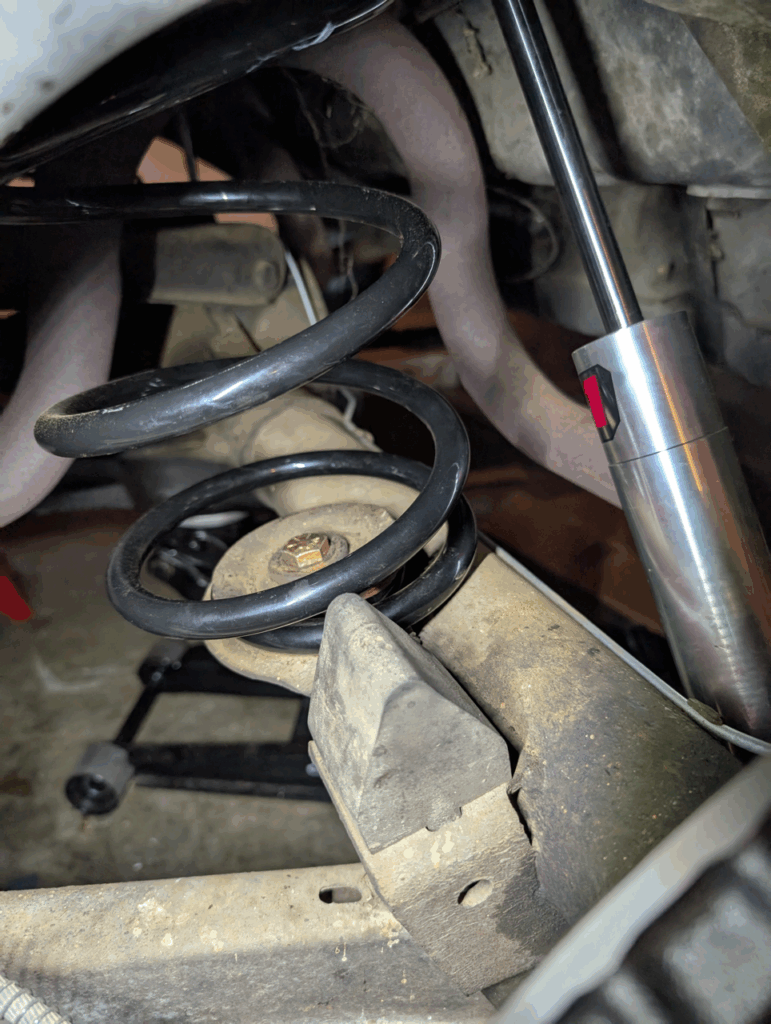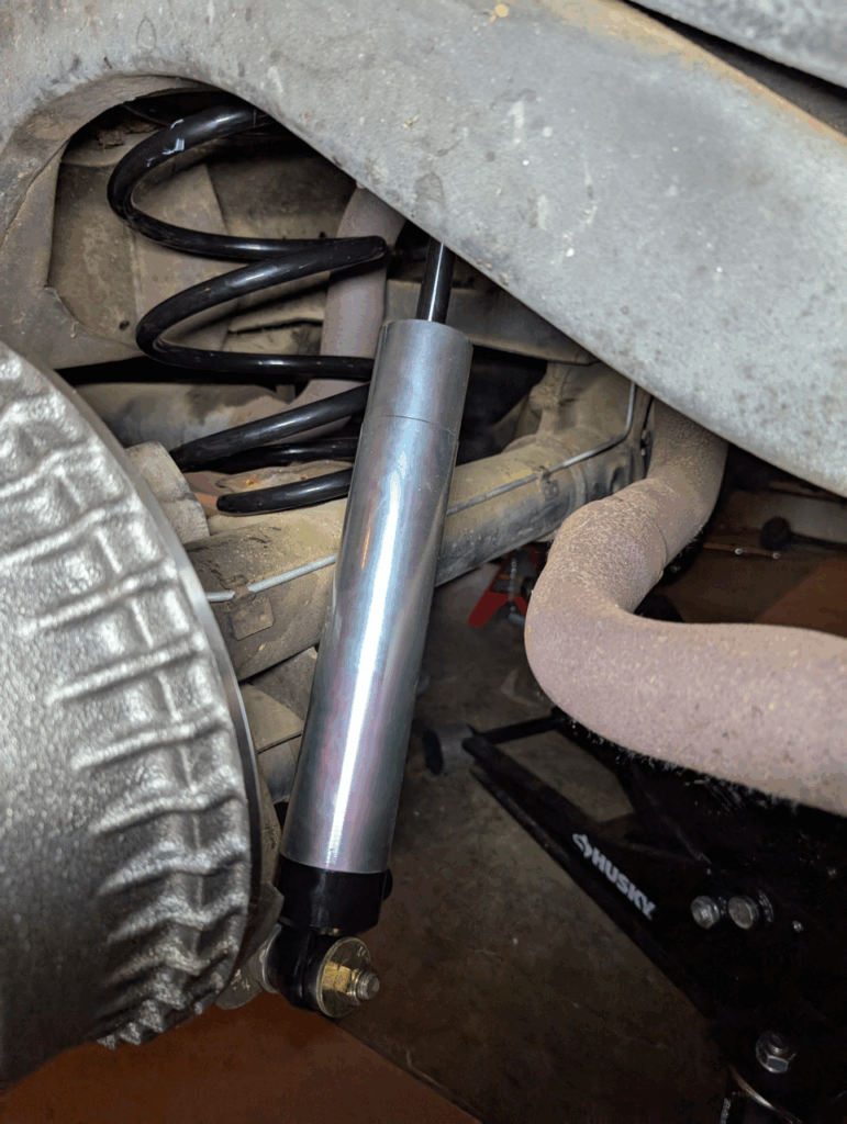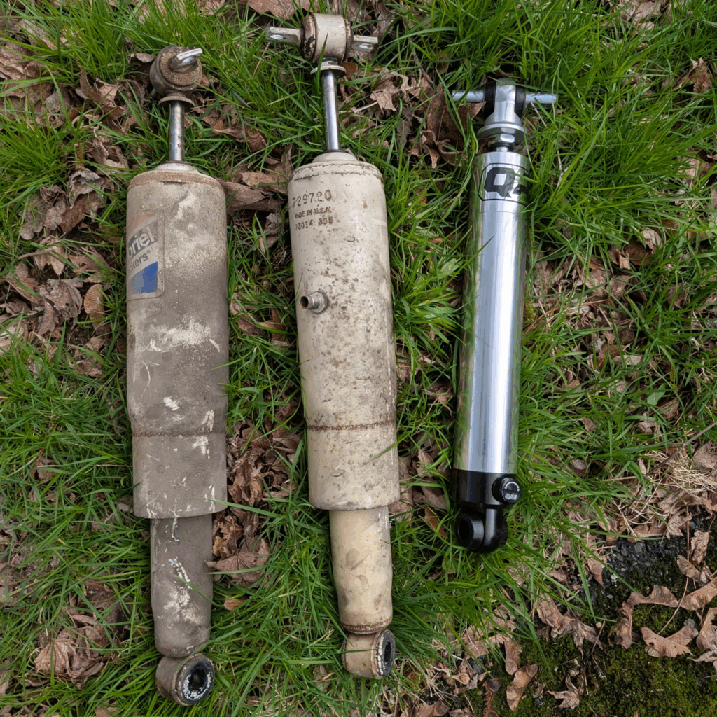 After rebuilding the front suspension, it made sense to address the rear too. My 35-year-old air shocks had given up – no longer holding air or providing comfort. I’d installed them in high school along with taller springs to clear rubbing wheels and tires, but with my recent switch to narrower tires, that clearance issue was gone and I wanted to drop the rear back down.